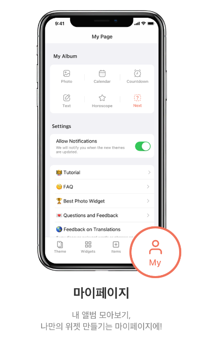내 위젯앨범 보기와 나만의 위젯만들기, 그리고 설정을 모두 보실 수 있어요.
